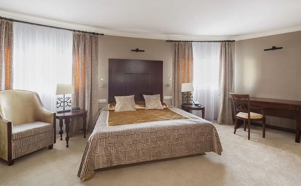 Просторный комфортабельный номер люкс площадью от 52,4 до 62,8 м2 с двумя комнатами (спальней и гостиной) и просторной гардеробной или шкафом. Интерьер люкса отличается сдержанностью и элегантностью, а цветовая гамма выдержана в благородных бежево-золотистых тонах. Одновременно в номере этой категории может проживать два человека, дополнительное место оплачивается отдельно.