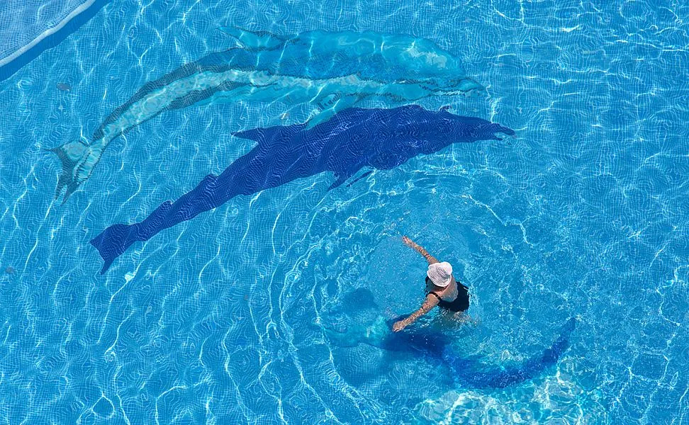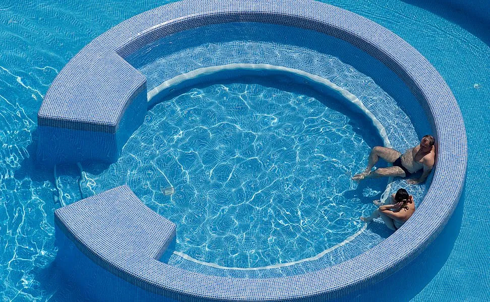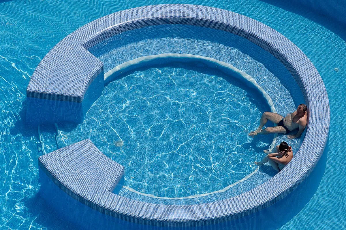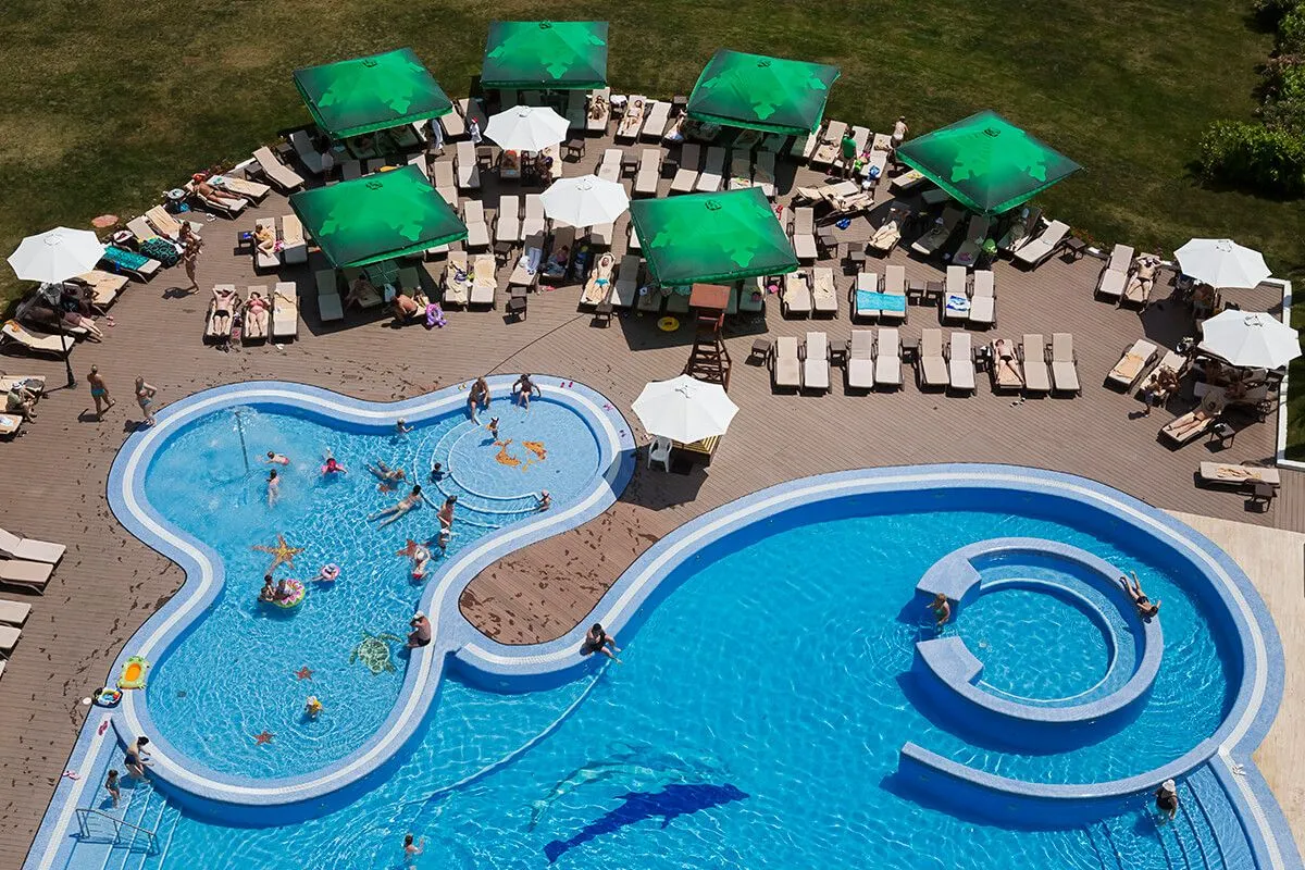 Даже если погода оставляет желать лучшего, у бассейна всегда много людей, ведь вода в нем подогревается до комфортной температуры. В детской зоне бассейна установлен фонтан-грибок.